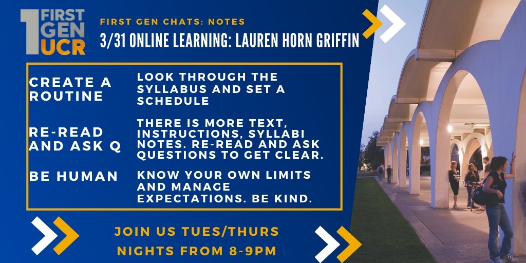Ucr First Generation Exceptional Tips From Lauren Horn Griffin On Online Learning In Tonight S Firstgen Chat Looking Forward To Thursday With Rena Burton Director Of The Academic Resource Center T Co 5tab4iopic